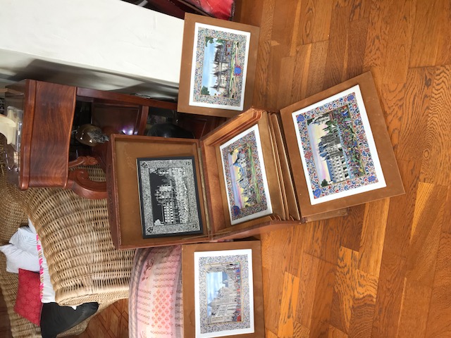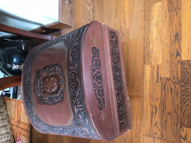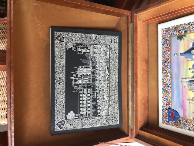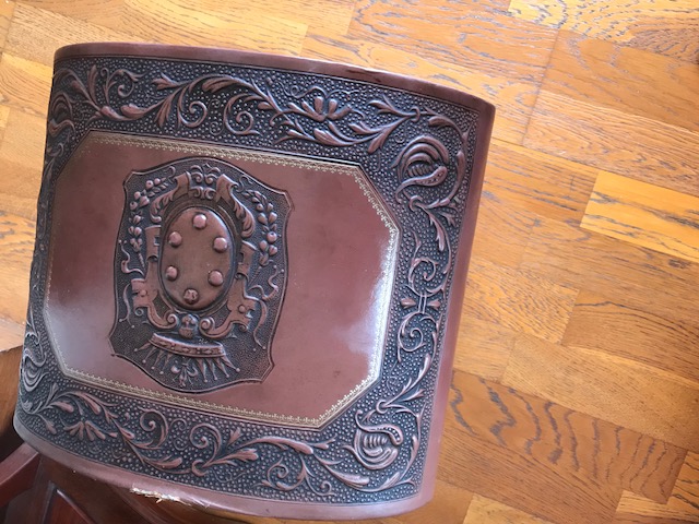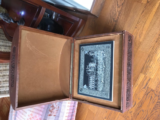 Coffret très beau cuir repoussé, 6 miniatures en porcelaine sur le thème châteaux de la Loire illustrées par Jean Gradassi: 1) Réception donnée par Jacques Coeur dans son palais pour son fils l’Archevêque de Bourges , 2) Festin donné par Louis XII dans la cour du château de Blois, 3) Départ à la chasse de François I à Chambord, 4) Henri II combattant en tournoi à Chaumont, 5) Catherine de Médicis à Chenonceaux, 6) L’arrivée du carrosse de Louis XII à Azay le Rideau. Miniature = 30 sur 22 cm dans cadre 36,5 sur 30,5 cm. Poids: environ 1,700 kg. Etat exceptionnel. Chaque miniature a son explication au dos + crochet pour accrochage mural. Coffre = 33,5 sur 39,5 cm, hauteur de 26,5 cm. poids 3,6 kg environ. 2 petits défauts : légère éraflure sur un côté et un peu de bout de cuir manquant sur un autre côté. Un livret sur « Vie Coutume Moeurs 1400-1650 dans les châteaux de France » Préface de A. Castelot . certificat d’authenticité, » Décors de Paris », signé et numéroté