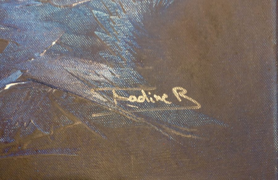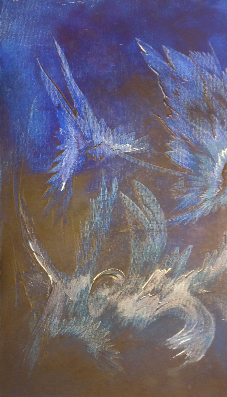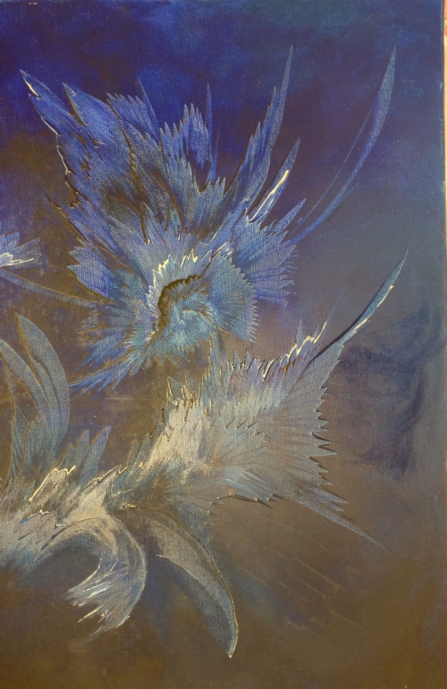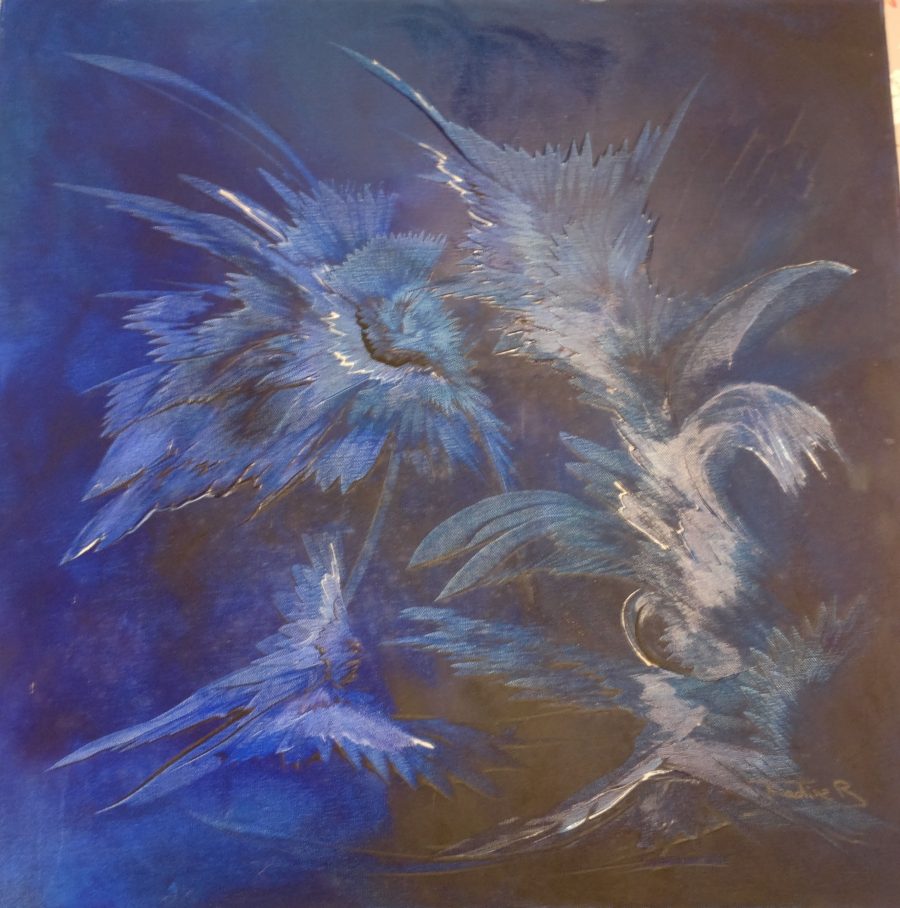 C’est un tableau avec des fleurs bleu abstraite.
