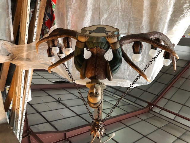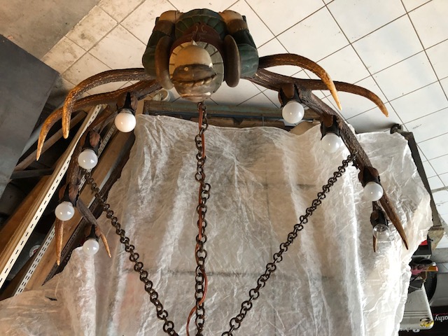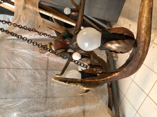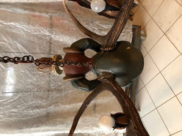 Lustre autrichien en cornes de cerf ,buste de femme sculptée en bois peint ,8 éclairages dans culots couverts de feuilles métalliques.Suspension par une chaine métallique.94 cm de large,30 cm de hauteur et 85 cm de long.Trés bon état général.