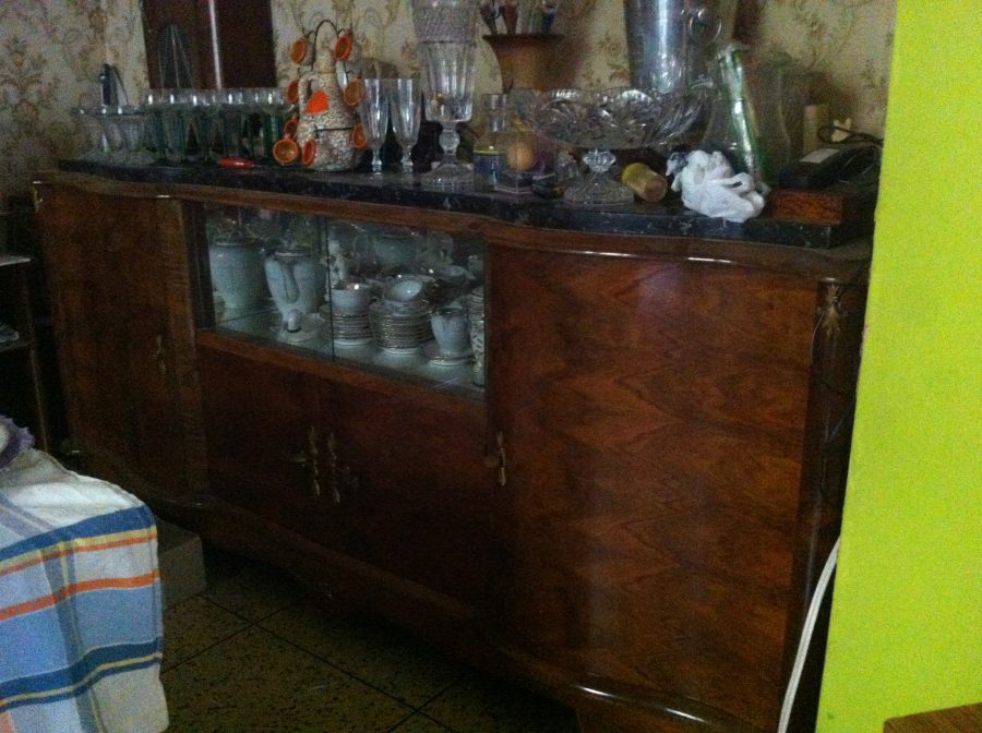 Salle à manger des années 50 en bois de ronce. Le buffet comporte une partie argentier et un épais marbre noir sur le dessus.