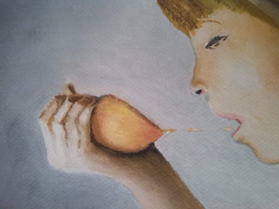 Représentation d’une jeune femme nue qui presse un quartier d’orange pour en boire le jus .
