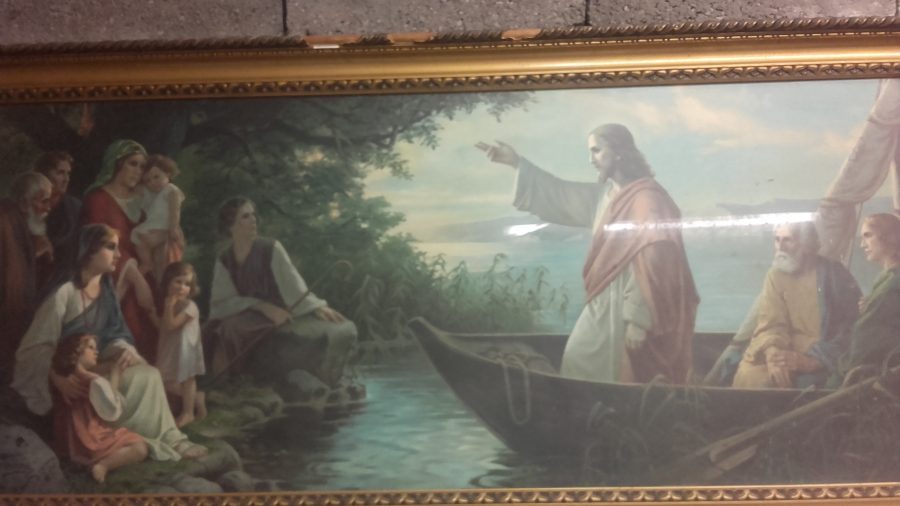 Jésus sur une barque avec 2 personne a bord et des gens sur la berge