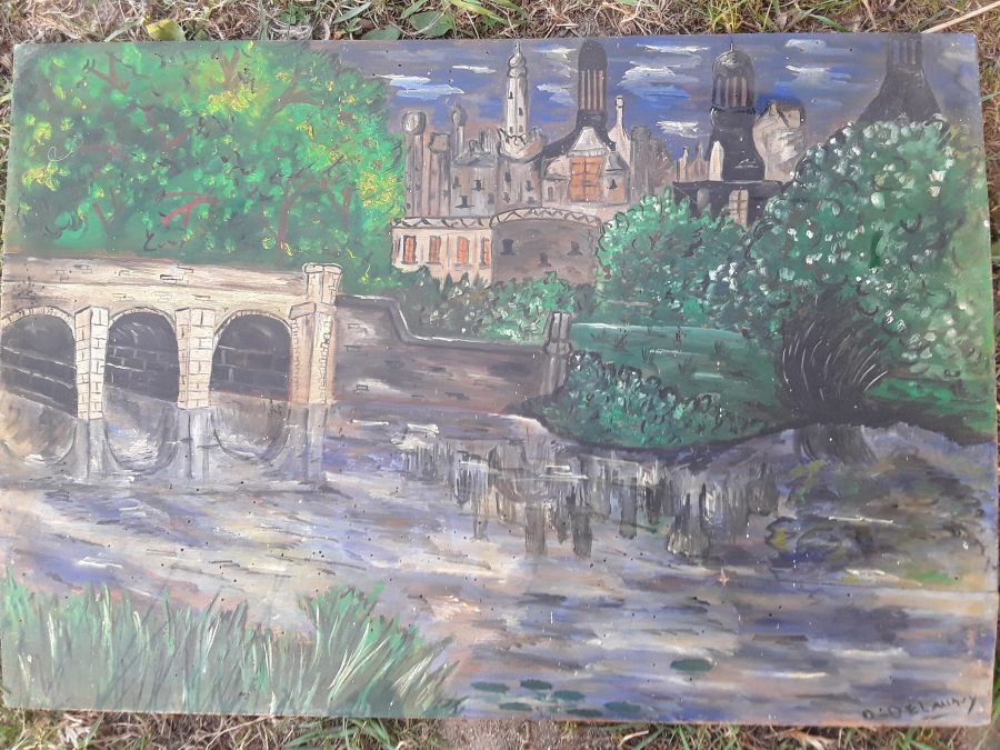 Peinture sur support bois représentant u pont et une rivière. En fond nous pouvons voir une ville.