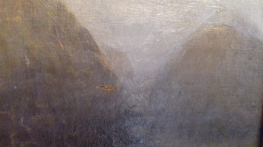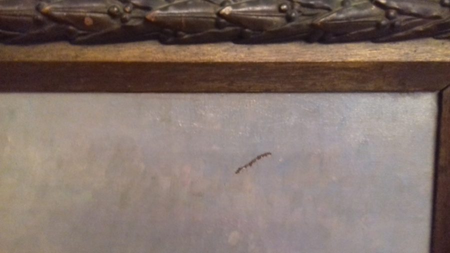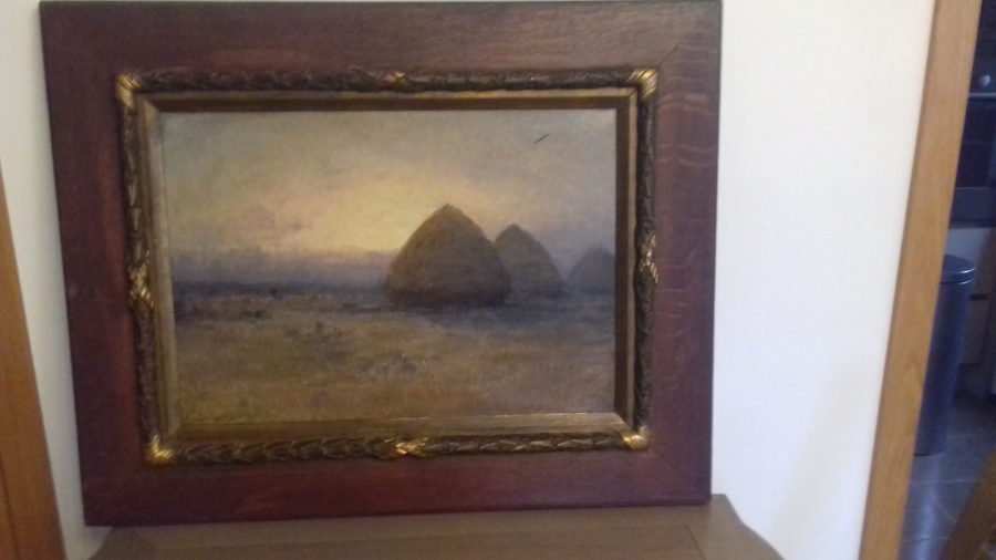 Meule de foin au soleil levant. Deux petits accrocs peinture sautée toile non abîmée. Hauteur avec encadrement 75 cm largeur 94 cm