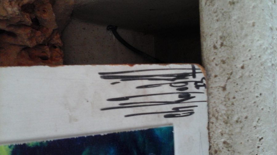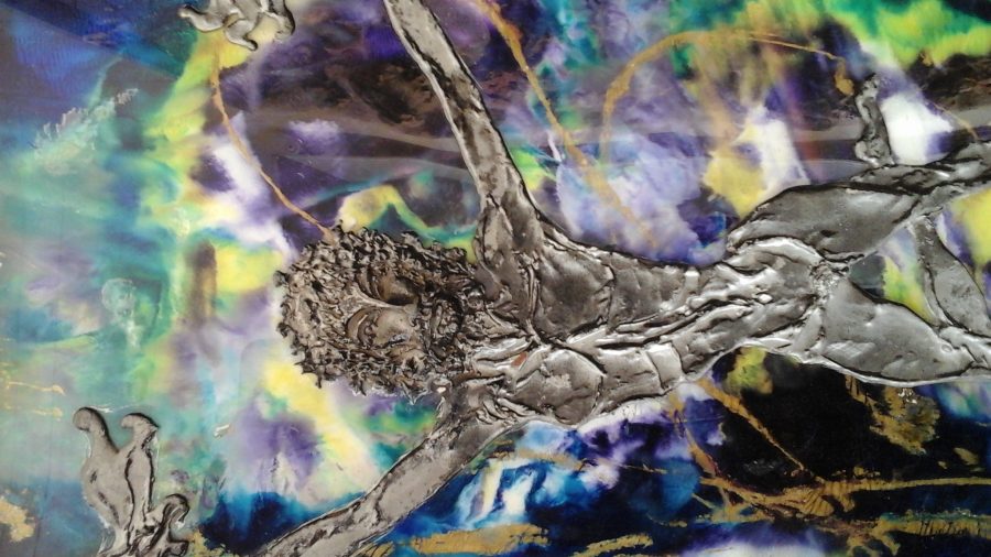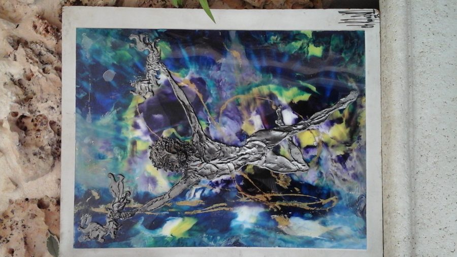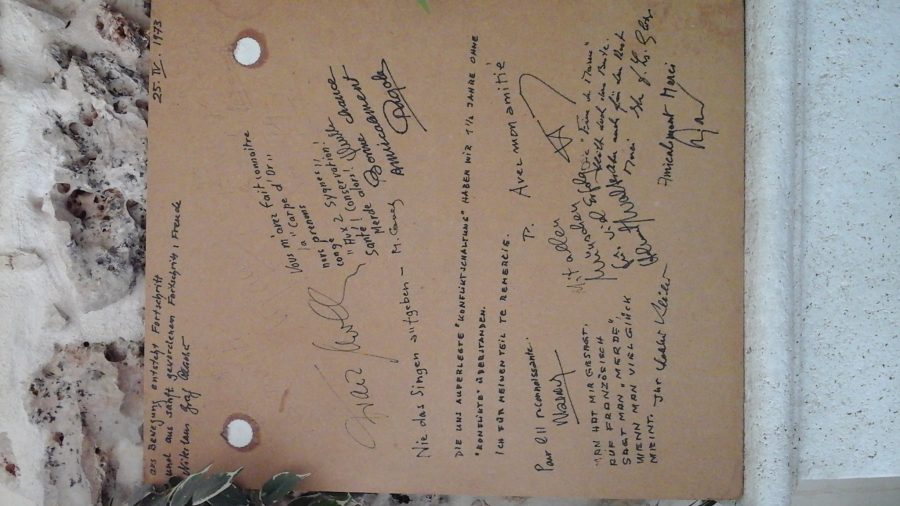 Une technique mixte sur panneau agloméré représentant un personnage qui tient une chouette à chaque extrémité de ses mains . Différentes variantes de peinture et le personnage est , je pense , en étaim . Au dos , en français et allemand , des remerciements signés . En haut à droite la date 25/04/1973 .dimensions : 59 cm x 45 cm .